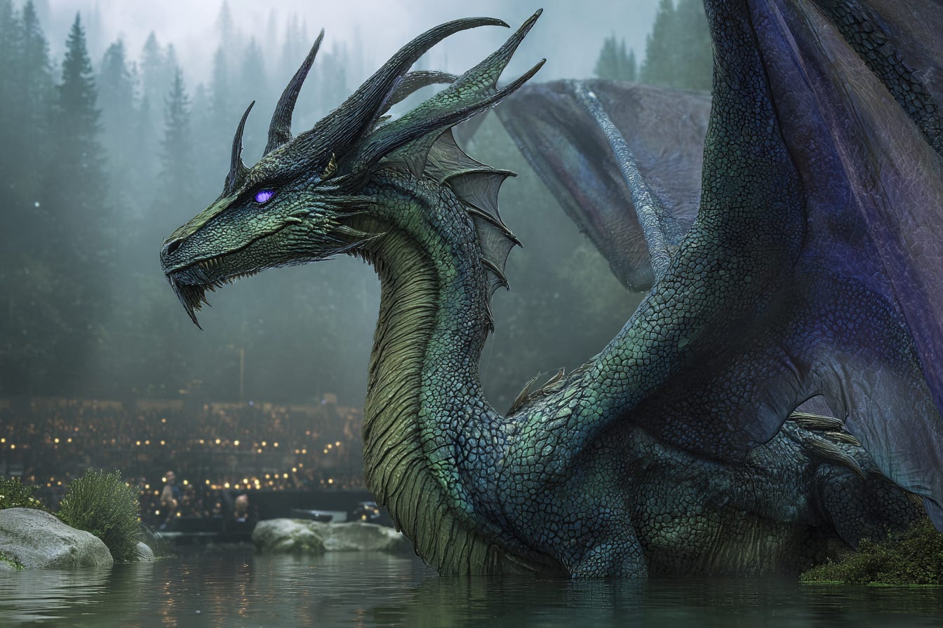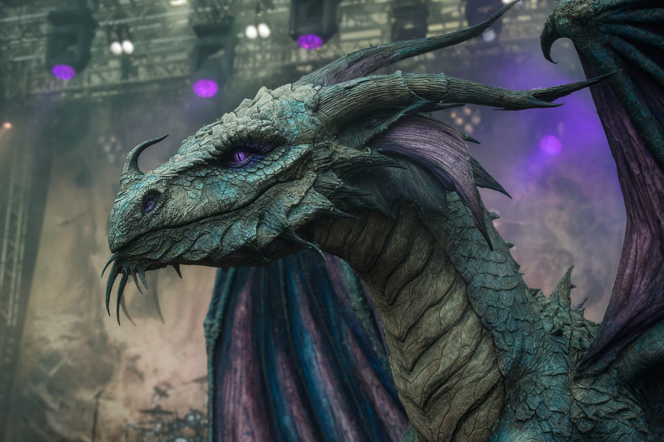 I saw a dragon coming through the huge concert screen that lined the back of the stage, it was obvious she was coming through from behind it – not out of it. She began moving into the stage onto the plank-like extension in the center that entered the middle of the “mosh-pit.” She was enormous, even bigger than the entire stage, with her body taking up most of the “plank,” her tail still mostly behind the screen and her long neck hovering above the masses of people in attendance. Her body was a dark green color and when she stretched out her bat-like wings the webbing between the green finger-like extensions was either a dark gray-blue or an eggplant purple. The dim lighting of the concert made it hard to tell which color I was seeing.